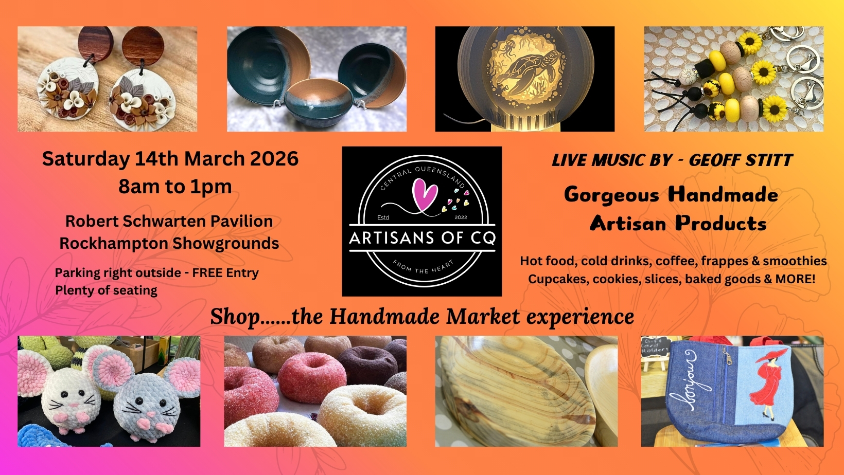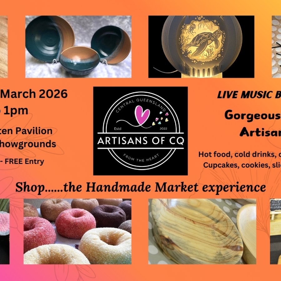 Artisans of CQ – Exclusively Handmade Market – 14th March from 8am to 1pm – Robert Schwarten Pavilion, Rockhampton Showgrounds – LIVE music – Burgers & Sausage Sizzle – Coffee, Cakes, Cookies, Confectionery, Plants, Gourmet Sauces & Jams, Gorgeous HANDMADE products – Plenty of seating, FREE entry, Parking right outside. Look for the big PINK flags! Artisans of CQ – https://www.facebook.com/profile.php?id=100085011938085
